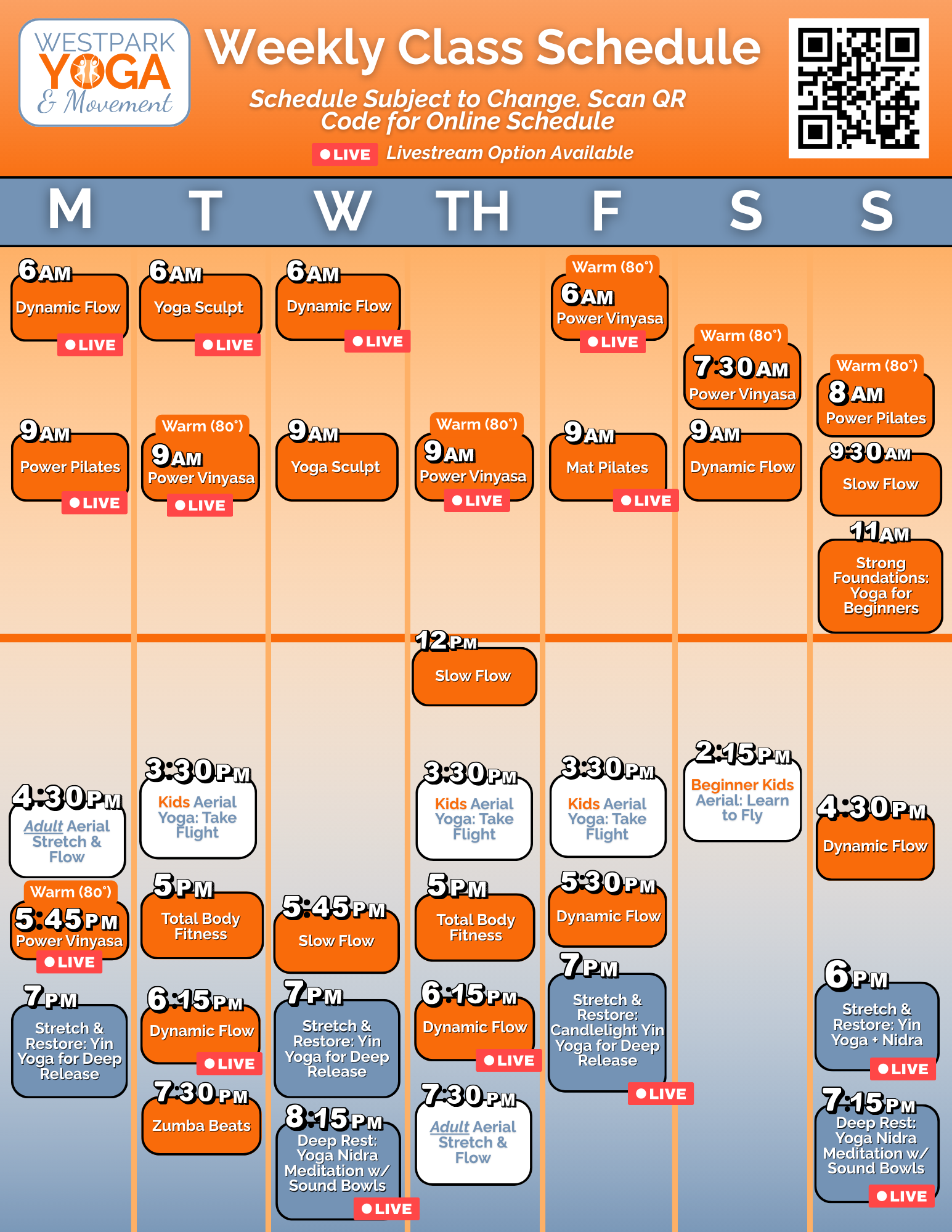 Our Weekly Class Schedule is subject to change. Please check the daily class schedule on the widget below for the most accurate daily class schedule.